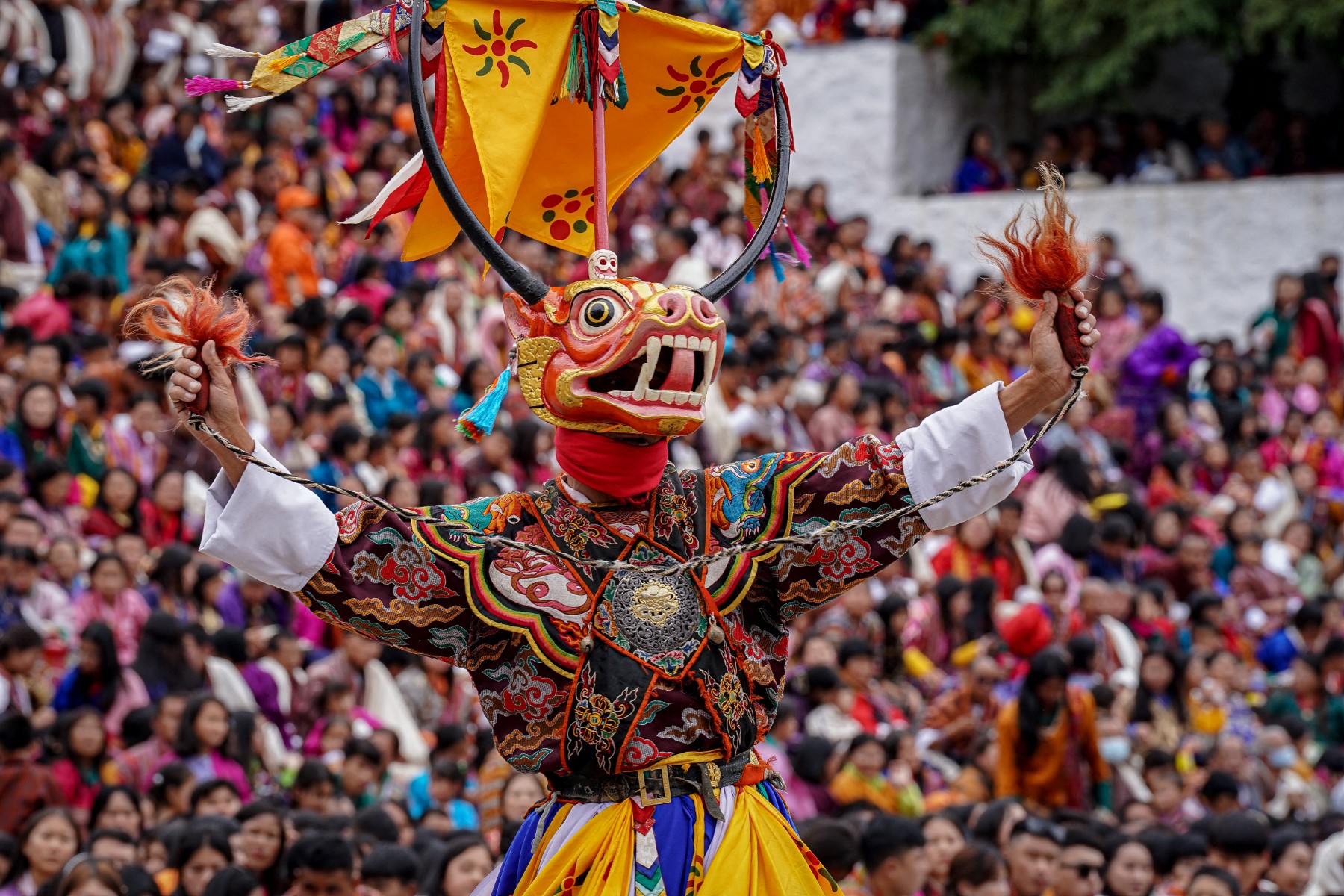 The media has played a significant role in promoting Bhutan’s unique Gross National Happiness (GNH) framework, that supports democratic values while seeking to maintain traditional culture. A dancer performs Cham dance during the ‘Thimphu Tshechu’ festival at Tashichho Dzong Buddhist monastery in Thimphu on September 14, 2024. Credit: Upasana Dahal / AFP